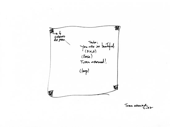 2010, 1998, instalação, 4 colunas, voz gravada reproduzindo texto (em Inglês). Duração: 24’’ em ‘loop’ (texto: 18″ + pausa: 6″)